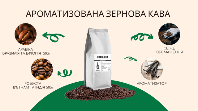 Ароматизована зернова кава — це гармонійне поєднання 50% арабіки та 50% робусти, яке після обсмажування проходить процес ароматизації натуральними харчовими арома-оліями. Така технологія збагачує каву насиченим смаком і ніжними ароматичними нотами.